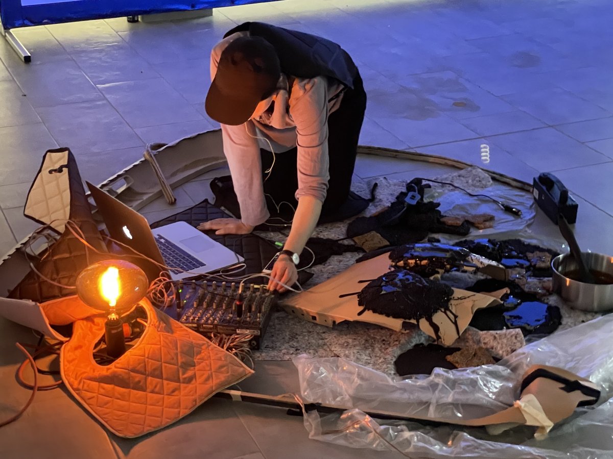 During the performance they pour a sticky, thick sirup over a landscape of mended car parts, dried asphalt pancakes and their cracked surfaces. By filling the broken cracks of the pancakes with the sticky liquid, the pancakes are being prepared to be served to the attendants of the performance as a collectively shared ritual. The process of covering and mending is accompanied by a synthesized voice imitating the sounds of cars with combustion engines driving by in the distance. Simultaneously steam is blowing out of a fog machine and through the asphalt landscape, inviting associations towards transcendent modes of speech and healing rituals as provided by an oracle.