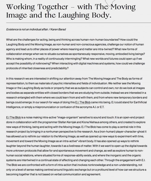 created to explore new ways of thinking (being, acting) with the Moving Image. With it we want to open up for human to non-human social relations, where situated forms of response-ability exisits, and where the digital and the organic systems are intertwined in a continual state of affecting and changing each other. E.I the Blob plays a central role in the artistic research project “Non-knowledge, Laughter and the Moving Image” where it has allowed us to rethink our relation to the moving image and see it as an "intra-active" vibrant body. With E.I the Blob we want to shift our attention away from the moving image and the body as forms of representations, to them as matter and waves of psychic intensities and fields of individuation. E.I could stand for Earthificial Intelligence, or simply a mispronunciation or confusion of the acronyms A.I. or E.T.