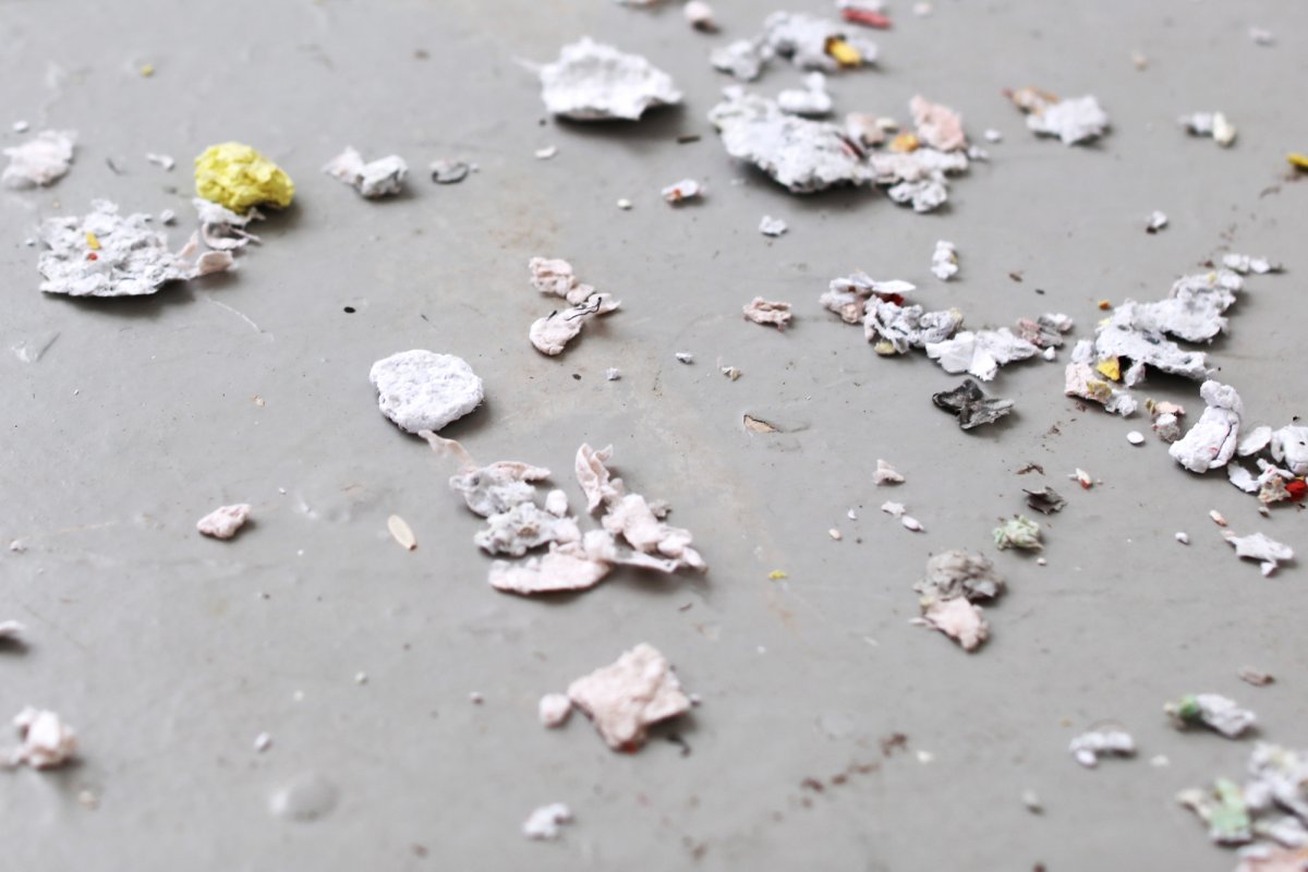 The work Pulps contain a big collection of found receipts, shopping lists, or other notes forgotten in pockets and washed in a washing machine