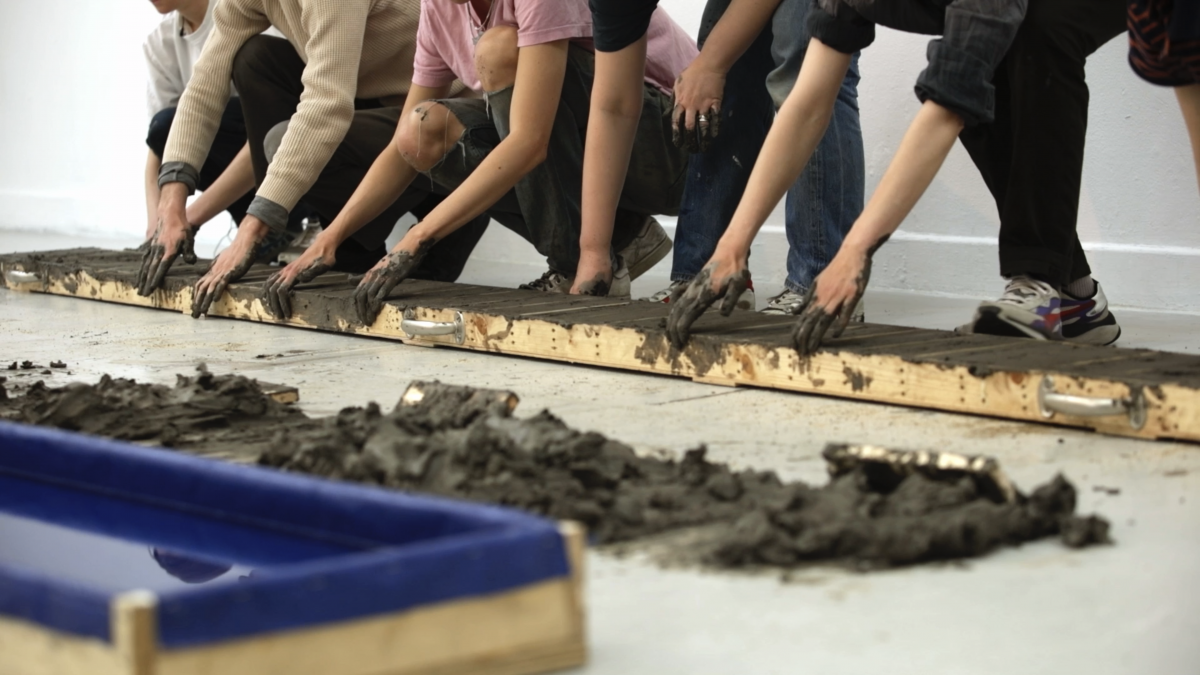 In this project I visit a construction site in Årsta outside Stockholm, and transport excess mud excavated from a depth of ten meters to my studio. I build a long segmented wooden frame, and invite others to join me in a collective attempt of manufacturing bricks. By making a longer frame, I created a tool that goes against its original function and the accordance to the body; choreographing the collective to balance and negotiate in between the steps of making the bricks. This becomes a method to force a mass into regular shapes, while the collective becomes subject to the production system’s inherent rigidity.