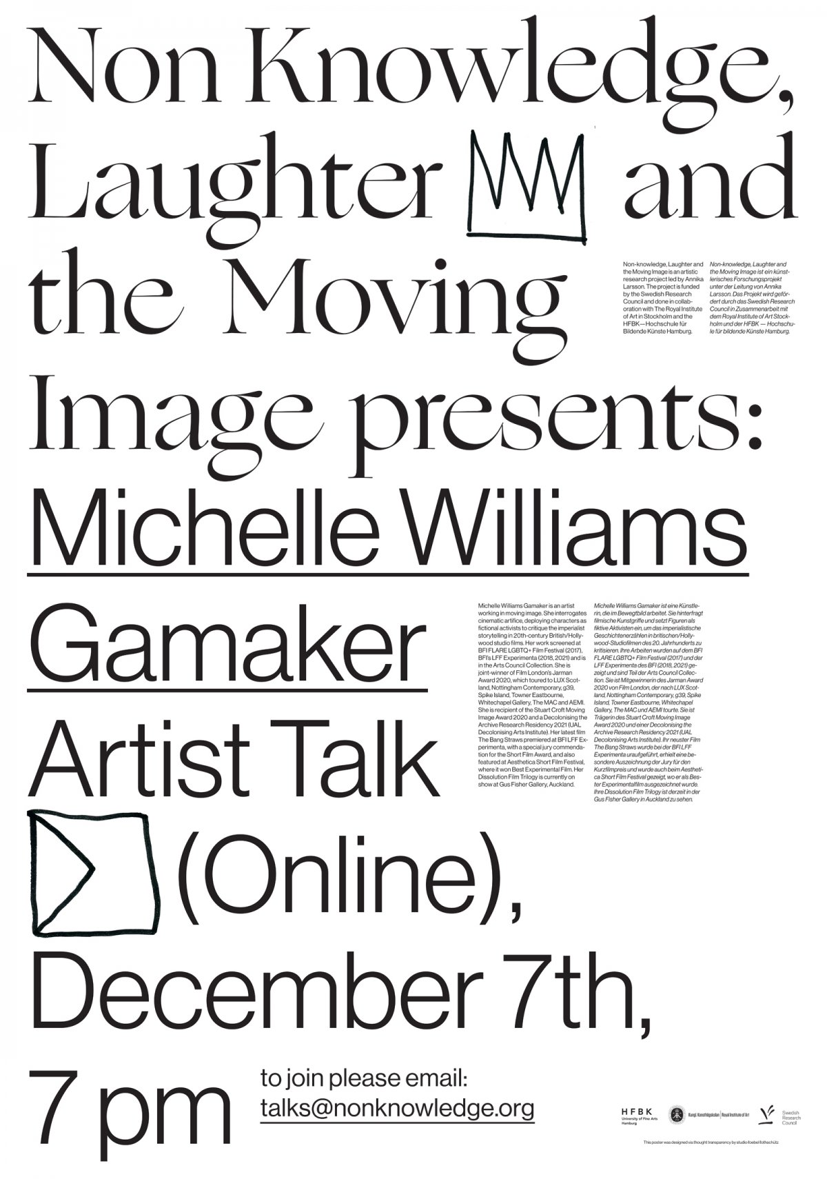Non-knowledge, Laughter and the Moving Image is an artistic research project led by Annika Larsson. The project is funded by the Swedish Research Council and done in collaboration with The Royal Institute of Art in Stockholm and the HFBK–Hochschule für Bildende Künste Hamburg