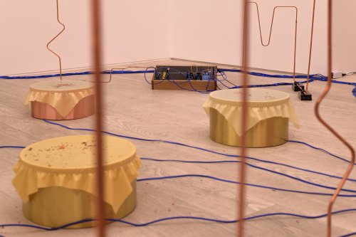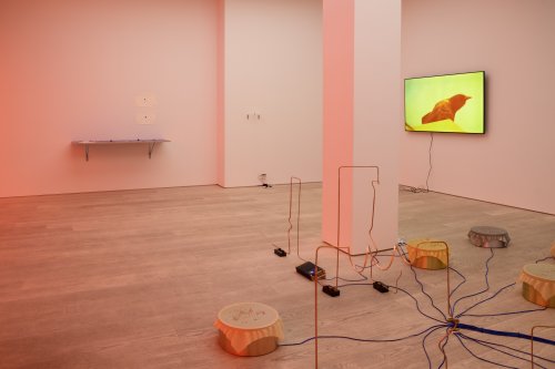 Playing with aspects of quantum phenomena such as superposition (of being at two places at the same time), entanglement and interference, Strange Powers - Prologue also extends into the room where it is accompanied by the works Theremins & Drums and Fuzzy Speakers. Similar to the "canary in the coal mine”, or other sentinel species and detecting machines, the two aforementioned works are fragile systems with sensors beyond the human. This gives them both the ability to detect potential dangers, as well as to show us the interconnection between currents, fields, bodies and matter.