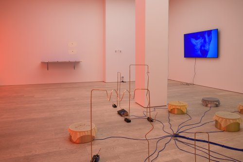 The exhibition – STRANGE POWERS - explores the highly sensitive nature of complex systems. Larsson brings together a series of works that through poetic, sonic and filmic interventions embrace the powers of small and unruly forces, asking how they can participate in rethinking the politics of space, time, matter and the unknown. Throughout the exhibition, the colour scheme of red and blue make subtle nods to the theoretical framework of the exhibition and its thematic. The red-foiled windows recall the hues of skies affected by air pollution or the poisonous atmospheres caused by wildfires. Copper phthalocyanine is a blue dye found in many household items, but the raw material can also fill a critical need in the quest for a quantum computer as a magnetic quantum metamaterial.